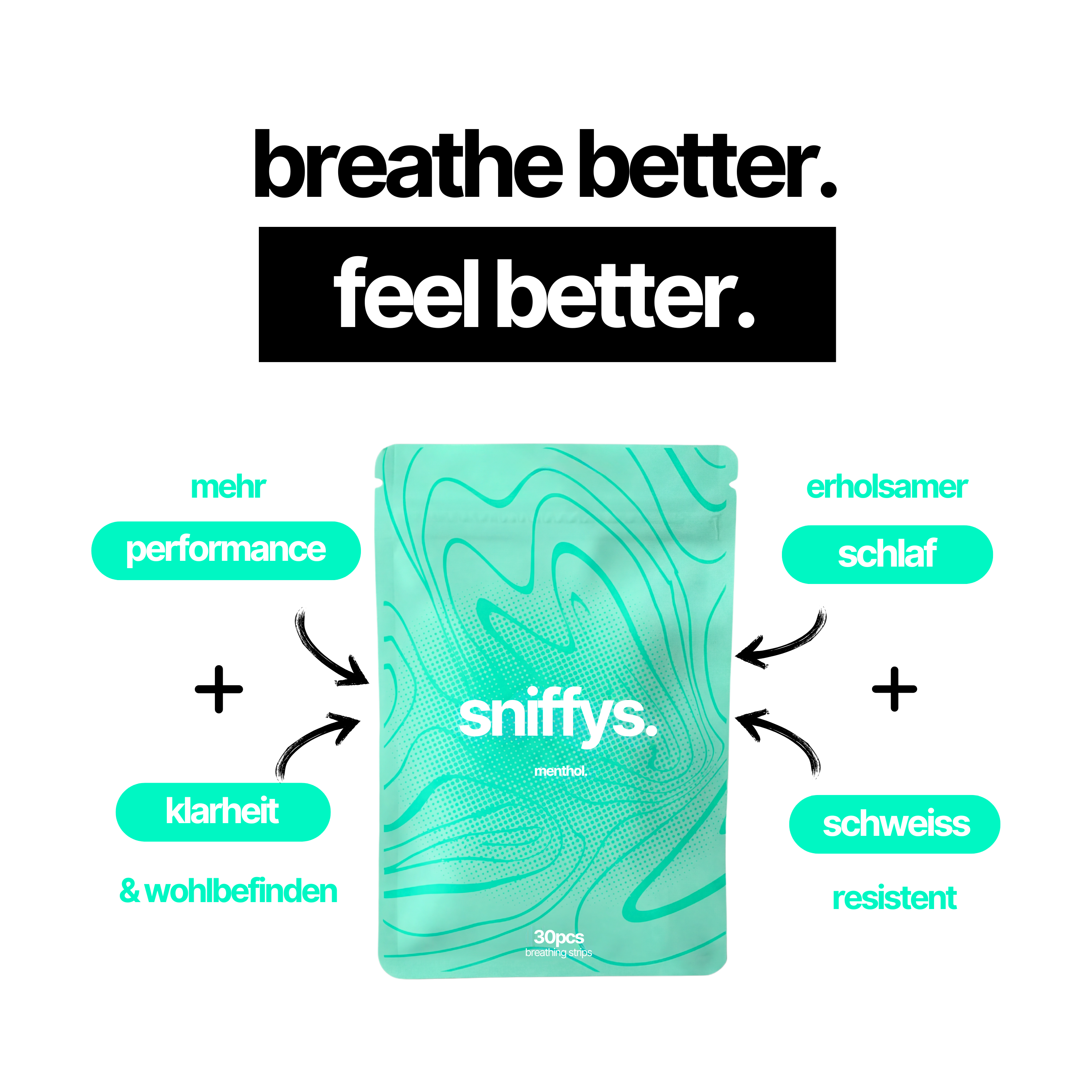 sniffys. öffnen die Nasenlöcher. Dank unserer integrierten Streifen erhalten Sie automatisch eine verbesserte Luftzufuhr. Das erleichtert die Nasenatmung und bietet Ihnen bessere sportliche Leistung, gesteigertes Wohlbefinden, eine optimierte Sauerstoffversorgung und verbesserte Schlafqualität.